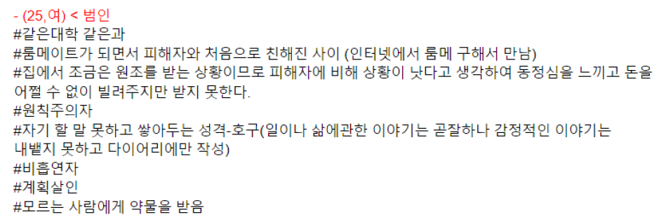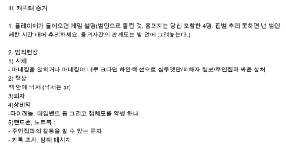 초기 게임 시나리오중 일부입니다. 피해자를 죽인 범인의 특성만 해시태그 방식으로 간략하게 나열이 되어있었습니다.