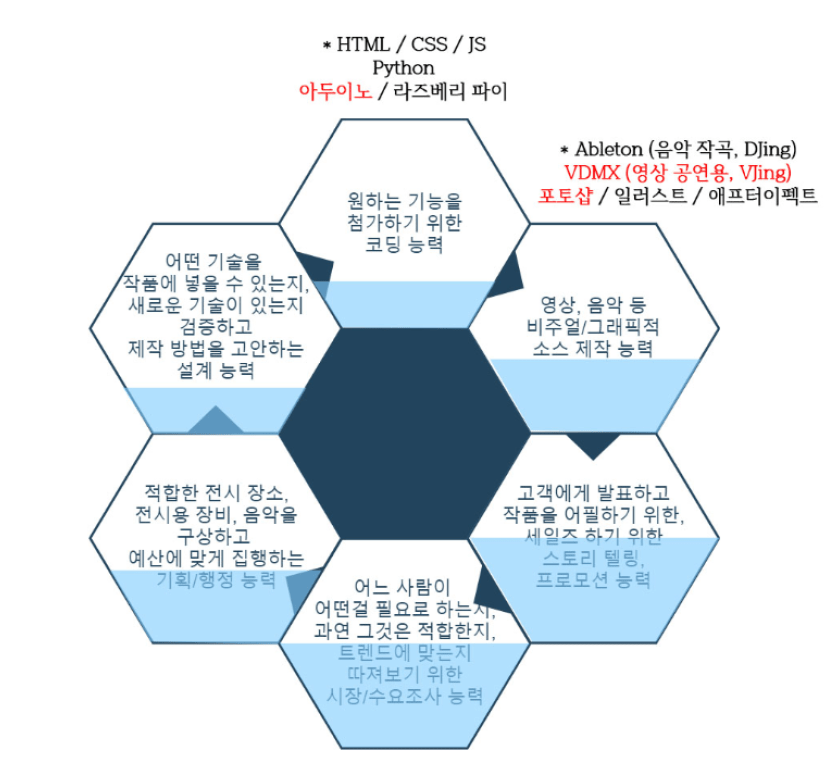 이를 위해서는 다양한 분야의 기능이 요구되는데요, 미디어 아트를 제가 하기 위해 필요한 부분을 제 나름대로 도식화 해보면 다음과 같습니다.